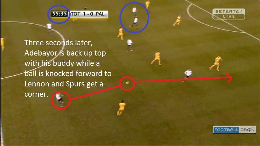 In the same move, Adebayor gets to the center circle, knocks around two quick passes to help Spurs unlock some space to play a forward pass to Lennon and while that passing move is taking place he gets back up top to be in a position for a potential ball from Lennon. Not trying to call out Soldado, but it needs to be said that part of Spurs renewed ability to score goals is probably from two strikers being played, but a lot of it seems to be from the simple fact that one of them is Adebayor.