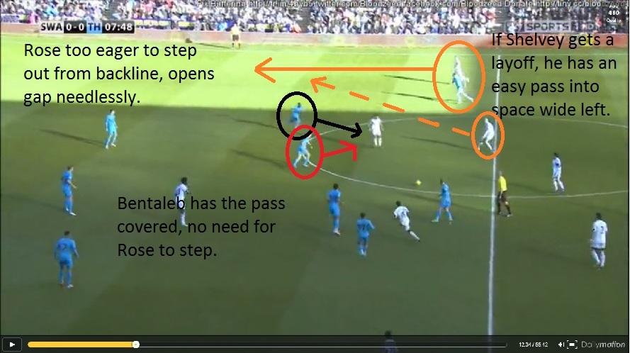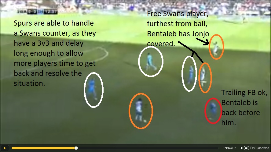 The problem lied in their lack of cover, not their willingness to get forward. Below, in a poor screenshot, we see Swansea on a three man break, that is matched by three Spurs covering in goal side positions and Walker trailing the play. Spurs resolve this situation and Swans are unable to create a chance from the break involving Bony and Shelvey, their most dangerous players on the day.