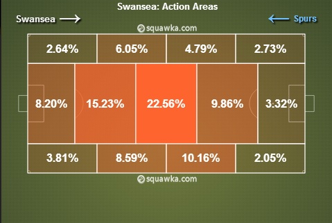 His role out wide at left mid was covered by Nacer Chadli, who had an extremely quiet game, he had no shots on goal, created one chance and didn’t make a tackle or intercept a pass. However, his constant presence in that wide position helped to force Swansea to play through the middle, as Lennon, as usual, did the same job on the right, he kept his width in all phases of play. Swansea had little ability to spread Spurs out or create overlaps with their fullbacks or play balls into Bony from wide positions. They were forced into the middle, where Spurs had even numbers and an ability for the wide players to then pinch in and tighten up the defense even more.