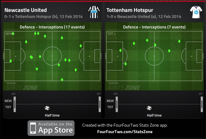 Despite owning more possession and working in Newcastle’s defensive third with almost a third of their passes the teams went into half time having both put two shots on target and Newcastle had seven total shots to Spurs six. The difference in the scoreline was thanks to a fantastic passing sequence from Spurs that saw them beat Newcastle’s pressing, move the ball out to the left flank where Bentaleb worked in a low slung cross across the face of goal that Krul had to try and parry to protect his far post. In doing so however, the deflection fell right to Adebayor who happily popped into the net and put Spurs on top inside twenty minutes.